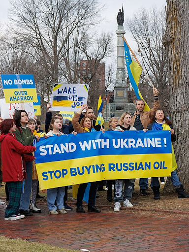 Protest and Rally to Support Ukraine in its struggle against Russian Aggression. In Boston Commons on March 6, 2022. Licensed under CC by 4.0. Original work by Zack Rudisin on Wikimedia Commons (https://commons.wikimedia.org)