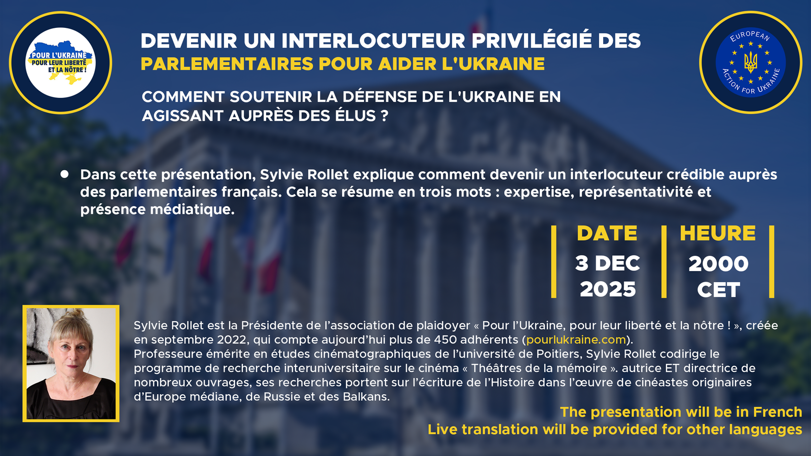 Această sesiune interactivă vă permite să descoperiți cum să acționați concret pentru a consolida sprijinul pentru Ucraina în cadrul societății și al guvernului francez. Veți învăța cum să comunicați eficient cu decidenții, să mobilizați publicul și să contribuiți la un plan colectiv în cadrul rețelei Acțiunea europeană pentru Ucraina (EAU).